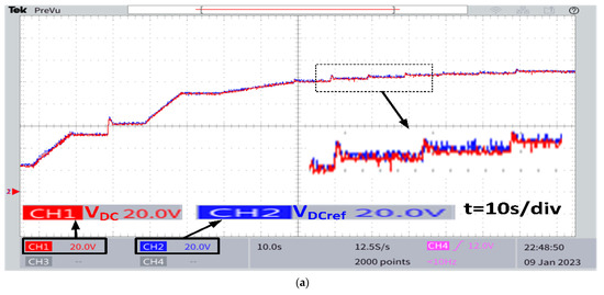 The NLSFC with a DO speed controller generated the reference armature voltage needed for the traction motor. Figure 14a shows the voltage following characteristics to prove the effectiveness of the voltage and speed controller. Channel 1 (red) shows the reference voltage generated by the speed controller and channel 2 (blue) represents the output DC voltage from the voltage controller. This voltage is fed as the armature voltage. Three areas are described in Figure 14a. The BU and SC-coupled H bridge converter ran in the buck mode when the output voltage was less than 40 V. The BU converter ran in the buck mode for output voltage ranges of 40 V to 60 V, while the SC converter worked in the boost mode. Both converters functioned as boost converters at output voltages greater than 60 V. Figure 14a shows these areas in detail. The simulated voltage following characteristic is shown in Figure 14b. The speed was directly proportional to the applied voltage, and the voltage pattern produced by the speed controller reflected this relationship.