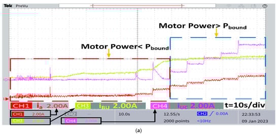 The results obtained from the experiment for sources and armature currents are shown in Figure 20a. As can be seen in Figure 20a, the load torque increased as the armature current (channel 1) rose. Most of the current demand was satisfied by the BU (channel 3) when the power demand at the motor side was less than Pbound. The SC in this region could only meet the need for instantaneous current (channel 4), and hence, instantaneous power. It is clear that the SC current grew significantly, whereas the BU current changed only slightly with increasing motor power demand. A similar observation is noted with simulated current characteristics, as depicted in Figure 20b.