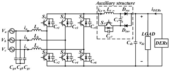In recent years, numerous ZVS techniques have been extensively studied in AC/DC and DC/AC converters. The more common method is to add an auxiliary resonant circuit in these converters. According to the locations of the auxiliary circuit, the ZVS techniques can be divided into two categories, i.e., AC-side or DC-side auxiliary circuits [3]. The auxiliary circuit on the AC side is mainly connected in parallel with the AC side of the converter, and thus, the auxiliary circuit has lower voltage stress. However, the system needs three auxiliary circuits for three phases, making it require more space and components. For the DC-side auxiliary circuit, the auxiliary circuit is placed between the DC bus and the main switches, and only one set of auxiliary circuits is needed. However, different auxiliary circuit structures will result in varying voltage stresses on the main switches that are approximately 1 to 3 times the DC link voltage in the rectifiers [4,5,6,7,8] and inverters [2,9,10,11,12,13,14,15,16,17,18,19,20,21]. Active clamping ZVS rectifiers [7,8] and ZVS inverters [2,17,18,19,20,21] with low voltage stress (about 1.01~1.1 times the DC link voltage) were proposed. Nevertheless, extra components, including an active switch, resonant inductor, and clamping capacitor, are required to compose a DC-side auxiliary circuit to achieve zero-voltage switching. Therefore, the ZVS converters without an auxiliary circuit were proposed [1,22,23,24,25]. The advantage of these ZVS converters is not requiring additional components. However, those converters based on critical conduction mode endure high current stress on the main six switches, requiring a third-order LCL filter or even three-phase output current ripple cancellation [25] to eliminate the current ripples. In addition, a bidirectional power flow ZVS operation mechanism in inverter and rectifier modes needs to be carefully considered.