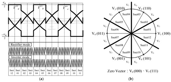 The proposed bidirectional grid-tied ZVS three-phase converter is shown in Figure 1, which is composed of a standard six-switch converter with an LC filter on the AC side and a bidirectional auxiliary resonant circuit on the DC side. In order to achieve bidirectional power flow, the voltage-oriented control (VOC) method is used to control the converter. In order to achieve soft switching, the proposed pulse-width modulation strategy ZVS DPWM shown in Figure 2 is used, where the control signals can be divided into 12 sectors during each line cycle. The positive/negative slope of the sawtooth carrier is decided using the DPWM and operation mode to generate the switching sequence and the selected zero vectors both in the rectifier mode and inverter mode, as shown in Figure 2a. While the converter is operated in the rectifier (inverter) mode and the controlled DPWM signals reach the maximum value, the slope of the sawtooth carrier is positive (negative). In contrast, when the DPWM signals reach the minimum value, the slope of the sawtooth carrier is negative (positive). While the DPWM control signal is a generalized DPWM (GDPWM) method, DPWM1 [26] was adopted in this study. By adding the zero-sequence signal to the three original modulation waves V*a, V*b and V*c, the GDPWM waves V**a, V**b and V**c are generated. Assuming |V*a| ≥ |V*b| and |V*c|, then the zero sequence signal is v0 = (sign(V*a))(Vdc/2) − V*a.