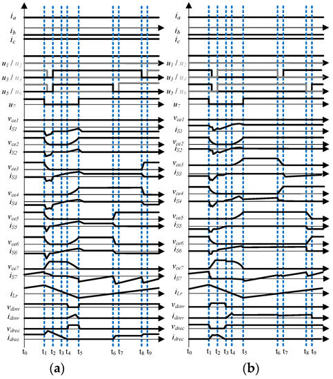 By employing the proposed DPWM strategy and the zero-vector selection illustrated in Figure 2, it becomes feasible to derive a twelve-sector switch modulation sequence within a line cycle. Take sector 1 as an example, and assume the three-phase current ia > 0 > ib > ic. For a convenient explanation of how the proposed modulation scheme works, the theoretical key waveforms during the sector 1 operation in both rectifier and inverter modes are illustrated in Figure 3 and the following assumptions are made to simplify the operation principle analysis of the bidirectional grid-tied ZVS three-phase converter.