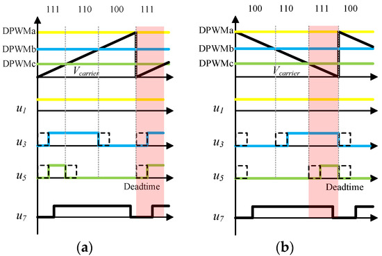 For the inverter mode, the switching scheme of the carrier is depicted in Figure 2. When the voltage clamp is set at +Vdc/2, the rising sawtooth waveform is utilized for that interval, while when the voltage clamp is positioned at −Vdc/2, the falling sawtooth waveform is employed for that interval. As a result, the sawtooth waveform undergoes a transition every 60 degrees. Combining this with DPWM1, the switching sequence illustrated in Table 3 is generated. Taking interval 01 as an example for analysis, the modulation sequence of the switches is 111 → 100 → 110 → 111.