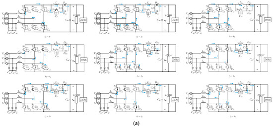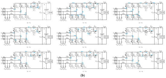 In order to understand the proposed control strategy in this topology operated in rectified mode, the steady-state key waveforms in sector 1 are shown in Figure 3a. The vector sequence during this sector is 111-110-100-111, as shown in Figure 4a. The corresponding operation state is explained as follows, and the equivalent circuit in each state is illustrated in Figure 5a.