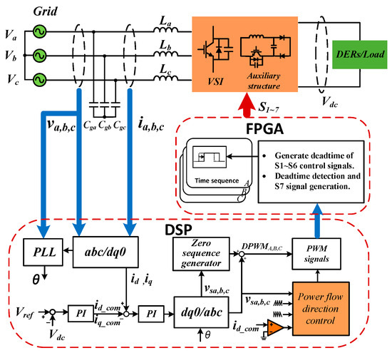 In order to control the bidirectional grid-tied three-phase converter via ZVS with the proposed modulation scheme, the control block shown in Figure 6 is used. Based on the voltage-oriented control scheme, the AC grid voltages, the DC DERs/load voltage, and AC-side currents are sensed and fed into the A/D converters, and then the phase lock loop (PLL) is utilized to synchronize the AC grid voltage. Thus, the control signals in the abc nature reference frame are transformed into the d-q synchronous reference frame. To achieve the bidirectional power flow control, the d-axis current command is utilized to judge the power flow direction (PFD) and generate the corresponding DPWM modulation control scheme and main and auxiliary switch control signals to achieve zero-voltage switching, both in the rectifier and inverter operations. Meanwhile, the reverse recovery currents of body diodes in the main switches are also suppressed.