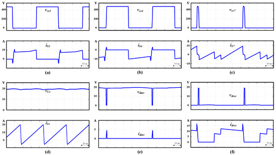 Simulated waveforms of the proposed bidirectional soft-switching converter operating in the inverter mode: (a) voltage and current of switch S4 (ZVS turn-on), (b) voltage and current of switch S3 (the diode reverse recovery current was suppressed), (c) voltage and current of auxiliary switch S7, (d) the clamping capacitor voltage vCc and resonant inductor current iLr, (e) voltage and current of diode Dinv, and (f) voltage and current of diode Drec.