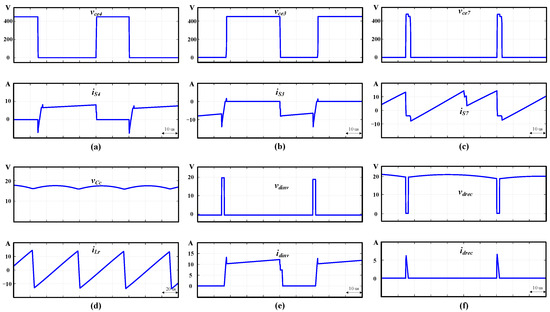 Next, consider the proposed bidirectional grid-tied ZVS three-phase converter that was operated in the inverter mode. The simulation waveforms of switch voltage and current for the main switches S4 and S3 are shown in Figure 9a and Figure 9b, respectively. As can be observed from Figure 9a,b, S4 was turned on under the ZVS condition, and the diode reverse recovery current in S3 could be suppressed when S3 was turned off. Figure 9c shows the voltage and current waveforms of auxiliary switch S7, and it can be seen from Figure 9c that S7 was turned on under the ZVS condition. The voltage of the clamping capacitor vCc and the current of the resonant inductor iLr are shown in Figure 9d. It follows from Figure 9d that vCc was much smaller than Vdc such that the voltage stress on the main and auxiliary switches was vcc + Vdc ≈ Vdc. The voltage and current waveforms of diodes Dinv and Drec are shown in Figure 9e and Figure 9f, respectively. As can be observed from Figure 9e,f, the diode voltage stress was vCc, which was the same as that in the rectifier mode and was much smaller than Vdc.