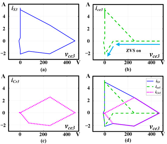 The ZVS process of switch S3: (a) switch current is3 vs. switch voltage vce3, (b) current ice3 vs. switch voltage vce3, (c) capacitor current icr3 vs. switch voltage vce3 and (d) the overlap of (a–c) when the proposed bidirectional soft-switching converter was operating in the rectifier mode.