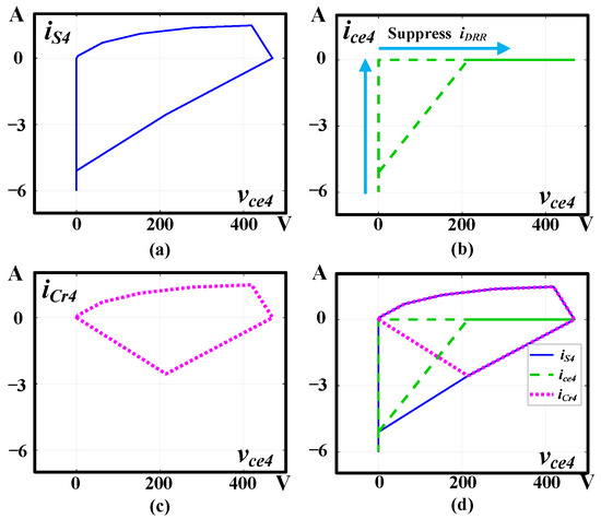 The process of diode reverse-recovery suppression of switch S4: (a) switch current is4 vs. switch voltage vce4, (b) current ice4 vs. switch voltage vce4, (c) capacitor current icr4 vs. switch voltage vce4 and (d) the overlap of (a–c) when the proposed bidirectional soft-switching converter was operating in the rectifier mode.