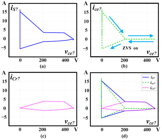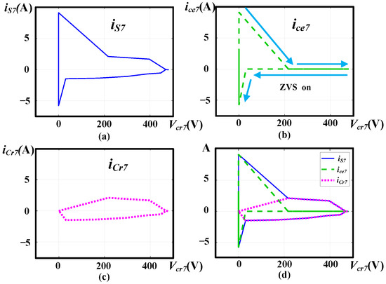 The ZVS process of switch S7: (a) switch current is7 vs. switch voltage vce7, (b) current ice7 vs. switch voltage vce7, (c) capacitor current icr7 vs. switch voltage vce7 and (d) the overlap of (a–c) when the proposed bidirectional soft-switching converter was operating in the rectifier mode.