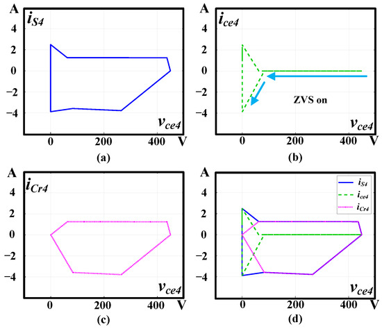 The ZVS process of switch S4: (a) switch current is4 vs. switch voltage vce4, (b) current ice4 vs. switch voltage vce4, (c) capacitor current icr4 vs. switch voltage vce4 and (d) the overlap of (a–c) when the proposed bidirectional soft-switching converter was operating in the inverter mode.