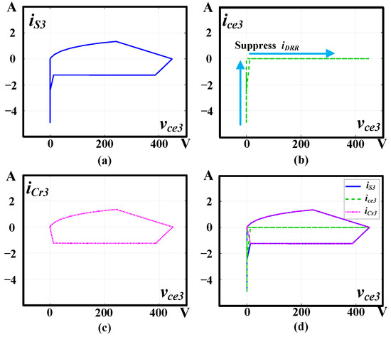 The process of diode reverse-recovery suppression of switch S3: (a) switch current is3 vs. switch voltage vce3, (b) current ice3 vs. switch voltage vce3, (c) capacitor current icr3 vs. switch voltage vce3 and (d) the overlap of (a–c) when the proposed bidirectional soft-switching converter was operating in the inverter mode.