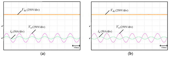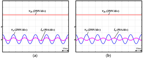 The simulated waveforms of the DC bus voltage Vdc, phase-a voltage Va and current ia of the proposed bidirectional grid-tied ZVS converter operated in rectifier mode and inverter mode are shown in Figure 16a and Figure 16b, respectively. As can be seen from Figure 16, when the system was operated in the rectifier mode, the controlled grid-side current was in phase with the grid voltage, and when the system was operated in the inverter mode, the controlled grid-side current was phase-shifted by 180 degrees from the grid voltage.