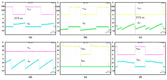 Measured waveforms of the proposed bidirectional soft-switching converter operating in the rectifier mode: (a) voltage and current of switch S3 (ZVS turn-on), (b) voltage and current of switch S4 (the diode reverse recovery current was suppressed), (c) voltage and current of auxiliary switch S7, (d) the clamping capacitor voltage vCc and resonant inductor current iLr, (e) voltage and current of diode Dinv, and (f) voltage and current of diode Drec.