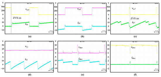 While the system was operated in the inverter mode, the measured switch voltage and current of switches S4, S3 and S7 are shown in Figure 18a–c, respectively. As can be seen from Figure 18a–c, the main switch S4 and auxiliary switch S7 were turned on via ZVS, and the diode reverse recovery current of main switch S3 was also suppressed. The voltage vCc of the clamping capacitor and the current iLr of the resonant inductor are shown in Figure 18d. It follows from Figure 18d that vCc was much smaller than Vdc such that the voltage stress on the main and auxiliary switches was vcc + Vdc ≈ Vdc. In addition, the voltage and current waveforms of diodes Dinv and Drec are shown in Figure 18e and Figure 18f, respectively. It follows from Figure 18e,f that the diode voltage stress was vCc, and the total voltage across the two series diodes was vCc = vdinv + vdrec.