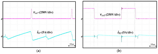 Similarly, the process of the ZVS operation and reverse-recovery-current suppression in the proposed bidirectional grid-tied ZVS three-phase converter operated in inverter mode are shown in Figure 13, Figure 14 and Figure 15. As can be observed from Figure 13, Figure 14 and Figure 15, the ZVS on of main switch S4, the reverse-recovery-current suppression of main switch S3 and the ZVS on of auxiliary switch S7 were indeed achieved in the inverter mode.