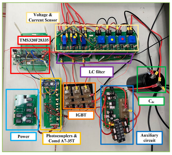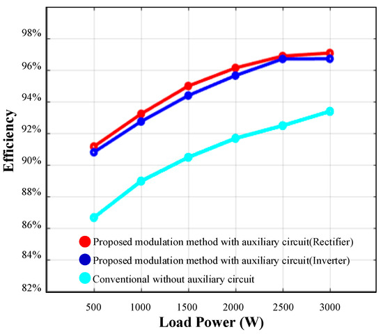 Next, the efficiency was measured using three YOKOGAWA WT310Es. Compared with the traditional hard switching SPWM without an auxiliary circuit, the measured efficiency of the proposed circuit topology and control scheme in the rectifier mode and inverter mode was 3~4% higher than that of the hard switching control scheme, which is illustrated in Figure 21. The realized prototype of the proposed system is shown in Figure 22.
