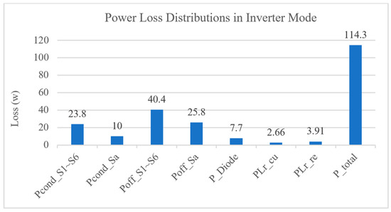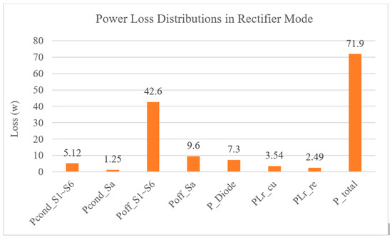 Finally, the current total harmonic distortion THDi and power losses were analyzed. Figure 23 shows the THDi versus output power for both rectifier and inverter operation. As depicted in Figure 23, it is evident that the higher the output power, the lower THDi became. Next, the power loss distributions are shown in Figure 24 and Figure 25 for the rectifier mode and inverter mode, respectively. In the power loss distribution, the IGBT Semikron SKM200GB125D and diode Powerex CS240650 were adopted in the simulation software to analyze the conduction loss, turn-off loss, diode loss, copper loss and core loss. As can be seen from Figure 24 and Figure 25, the total power loss during inverter operation was higher than that during rectifier operation due to the difference in auxiliary circuit paths between the inverter and rectifier operations.