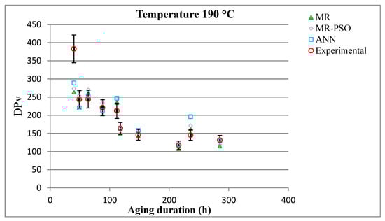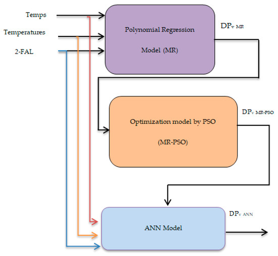 The methodology began with the establishment of the multiple regression (MR) model using experimental datasets. The coefficients of the MR model were then optimized using the particle swarm optimization (PSO) algorithm to enhance its performance. Subsequently, the MR–PSO model was employed to train the ANN approach, capturing the nonlinear relationship between the degree of polymerization (DPV) and the variables of time, temperature, and 2-FAL parameters.