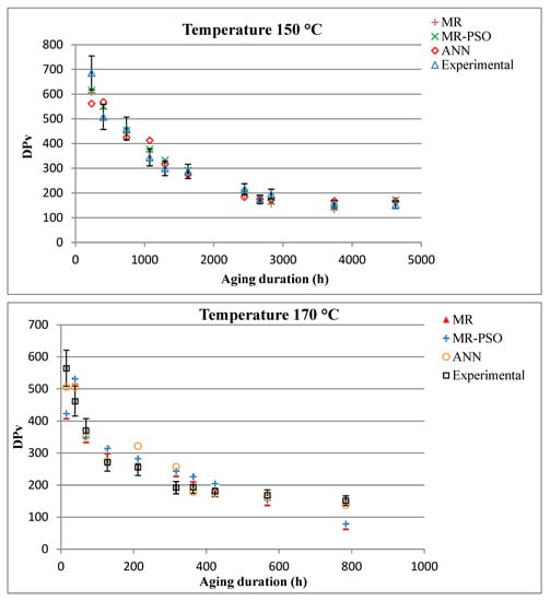 Experimental data along with corresponding error bars and predicted values of DPV versus aging time at different temperatures.