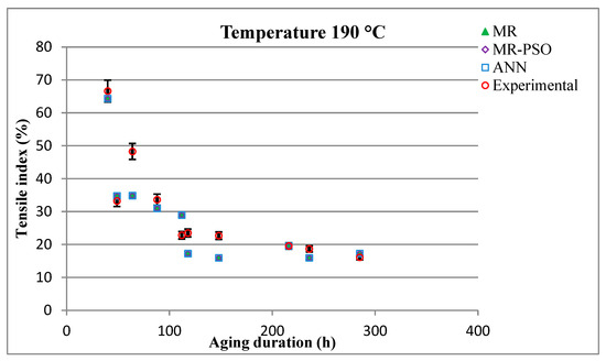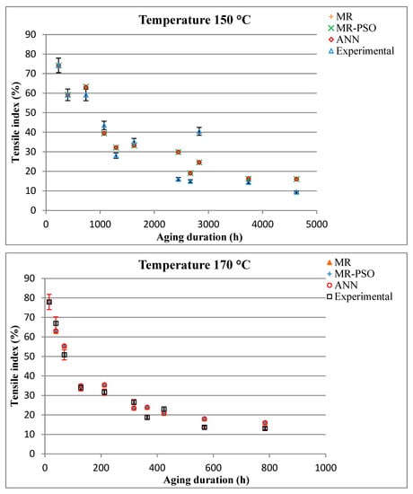 The good performance of this model was justified by the root mean square error (RMSE), the coefficient of determination (R2), and the mean absolute percentage error (MAPE). It can be observed that the results obtained show the effectiveness of the approaches developed based on artificial neural networks and multiple regression optimized by particle swarm optimization (PSO). From the obtained results, it can be concluded that the approaches developed in this work are able to model and predict the mechanical behavior of standard insulating kraft paper as a function of elapsed aging time.