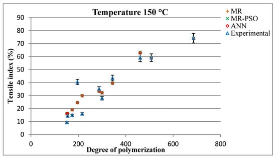 The comparison between the tensile index and degree of polymerization (DPV) is illustrated in Figure 8, where the experimental results are compared with the proposed correlation curve. Overall, there is a close agreement between the experimental data and the correlation curve, particularly for temperatures of 150 and 170 °C. However, at a temperature of 190 °C, there is some deviation. This suggests that the correlation curve captures the general trend of the relationship between the tensile index and degree of polymerization; however, there might be additional factors influencing the mechanical properties at higher temperatures.