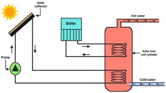 Solar water heaters are one of the most widely adopted solar thermal systems. These systems utilize solar collectors to absorb sunlight and heat a fluid, typically water or a mixture of water and antifreeze, which is then used for domestic hot water needs or space heating [72]. The working mechanism of a typical solar water heater is illustrated in Figure 2.
