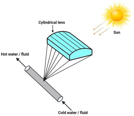 A Fresnel lens is another type of CSP system that utilizes a stepped structure to mimic the effects of a traditional curved lens while minimizing material usage. This design not only reduces manufacturing costs but also offers unique advantages in solar thermal applications [83]. By focusing sunlight onto a specific target, such as a solar receiver or heat exchanger, Fresnel lenses concentrate solar radiation and elevate temperatures, making them an attractive candidate for various thermal energy applications. Figure 5 illustrates the working procedure of a typical Fresnel lens.
