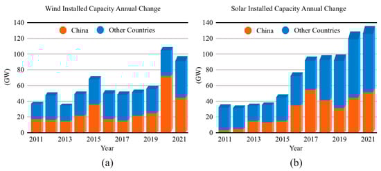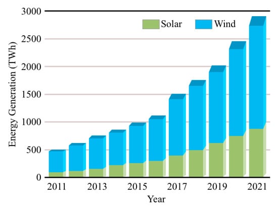 The demands for environmental protection and the promotion of low-carbon development have led to a gradual increase in the proportion of renewable energy sources, mainly wind and solar, in the power grid. Wind and solar energy have become the primary research subjects because the energy system has been more actively targeting these two energy sources. The statistics in Figure 1 show that global power generation from wind and solar sources has grown from 505.6 TWh in 2011 to 2894.4 TWh in 2021 [1]. The installed annual capacity for wind and solar energy is shown in Figure 2. Installed wind and solar capacity increased by 900 GW between 2015 and 2021, which is equivalent to an average annual growth rate of 18% [1]. In the next ten years, the anticipated installation capacities of wind and solar energy will increase at average annual rates of 14% and 18%, respectively.