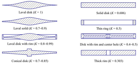 where e is the energy storage density of the flywheel, in Wh/kg, K is the shape coefficient of the flywheel, ρ is the density of the material, in kg/m3, and σ is the tensile strength of the material, in MPa. Figure 4 shows different shapes with their corresponding shape coefficients [17]. Table 2 lists the maximum energy storage of flywheels with different materials, where the energy storage density represents the theoretical value based on an equal-thickness-disc flywheel rotor.