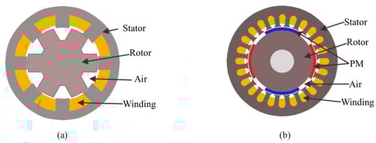 Structures of (a) a switched reluctance motor [57] and (b) a PM brushless DC motor [50].