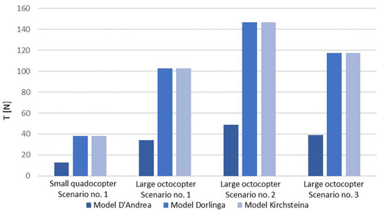Scenario no. 2 contains parameters that differ significantly in weight from scenario no. 1. The assumed weight is 5 kg, the highest payload of all three scales defined in the three scenarios. Specifying a greater weight of food delivered would not reflect accurate deliveries. A weight over 5 kg is probably relatively rare for people delivering food. The distance specified in scenario 2 is 2.7 km, the second-longest distance out of the three scenarios considered. The second scenario only assumes a large octocopter with a maximum payload of 7 kg. Scenario 3 defines a more significant distance to cover than in the two previously described scenarios, 4 km. Scenario 3 uses only the octocopter model for calculations. The assumed weight that the UAV transports for food delivery is 4 kg.