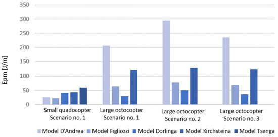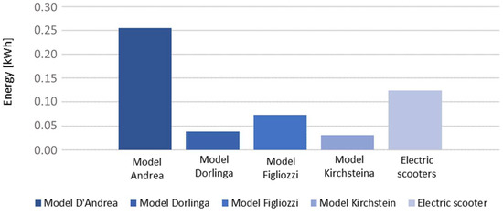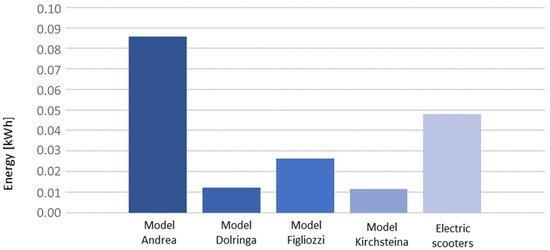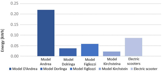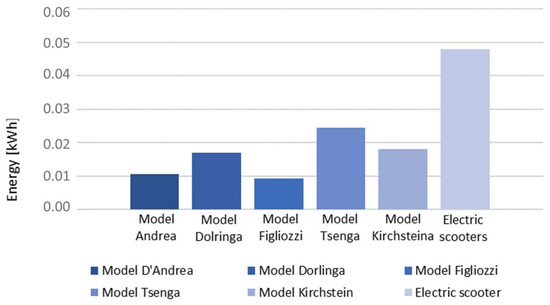 Figure 9 and Figure 10 are significantly different from Figure 8, with values 60% higher than the D’Andrea model in Figure 8. Due to differences in the weight of the transported product, there is no large discrepancy in the data described in the charts. Still, the D’Andrea model requires the most energy, followed by the electric scooter and drones described via the Dorling, Figliozzi, and Kirchstein models.