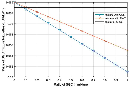 Figure 1 and Figure 2 show the prices of banana peel and sugarcane bagasse briquettes mixed with coconut husks and rattan waste, respectively. Figure 1 shows the proportion of CCS and RWT that must be added to BNP to obtain a mixed briquette with a lower cost than LPG. The figure shows that a mixed SGC–CCS briquette (92.25% SGC–7.75% CCS) or SGC–RWT briquette (88.9% SGC–11.1% RWT) costs the same as LPG, meaning EUR 0.063/kWh. These figures show that minimum percentages of 7.75% CCS and 11.1% RWT are required in mixed briquettes of SGC–CCS and SGC–RWT, respectively, for their costs to be lower than those of LPG. It can also be seen that the higher the proportion of CCS and RWT in the mixture, the lower the cost of the mixed briquette.