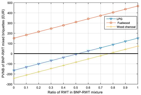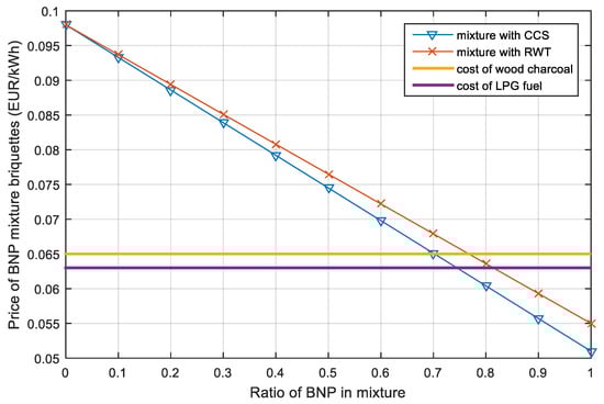 Figure 2 shows that a mixed BNP–CCS briquette (29.8% BNP–70.2% CCS) and a mixed BNP–RWT briquette (23.3% BNP–76.7% RWT) have the same cost as charcoal, i.e., EUR 0.063/kWh. On the other hand, a mixed BNP–CCS briquette (25.5% BNP–74.5% CCS) and a mixed BNP–RWT briquette (18.6% BNP–81.4% RWT) have the same cost as LPG. It also appears that a minimum proportion of 70.2% CCS and 76.7% RWT is required in BNP–CCS and BNP–RWT mixed briquettes, respectively, for their costs to be lower than those of charcoal.