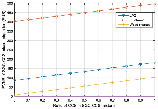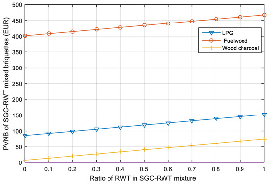 Figure 3, Figure 4, Figure 5 and Figure 6 present the results of the Present Value of Net Benefit assessment of the replacement of conventional household fuels with the studied mixed briquettes. Figure 3 and Figure 4 show the PVNB values of the SGC–CCS and SGC–RWT mixed briquettes, which are similar due to the very close characteristics of CCS and RWT briquettes. By observing these curves, it can easily be found that PVBN values are all positive, meaning that some of the biomass used to reinforce the SGC briquettes is economically viable for households. PVNB values for the replacement of LPG, fuelwood, and wood charcoal by mixed SGC-based briquettes are EUR 150, EUR 500, and EUR 100, respectively. These values are in line with the prices of conventional fuels. It may also be that the higher the proportions of CCS and RWT are in the mixture, the higher PVNB values are. In Figure 4, it can be seen that the PVNB values, for the whole range of the mixture ratio, are slightly lower than those in Figure 3, due to the higher value of RWT compared to CCS.