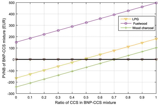 Figure 5 illustrates the PVNB values of the replacement of fuelwood, LPG, and wood charcoal with mixed BNP–CCS biomass briquettes. It appears that the use of mixed BNP–CCS briquettes instead of fuelwood is more cost-effective for a household due to the fact that pure CCS and BNP briquettes are more beneficial than fuelwood. The use of mixed briquettes is feasible for a ratio of at least 48% of CCS as a replacement for LPG and at least 70% of CCS as the replacement of wood charcoal.