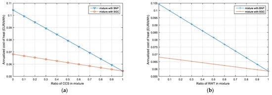 Annualized cost of heat of (a) CCS mixture and (b) RWT mixture briquettes.