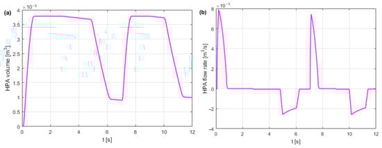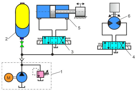 Figure 2 shows the hydraulic circuit for the different oil requirements of the cylinder and motor. The HPA, as well as a hydraulic fluid (oil) reservoir, provides an increase in the fluid requirement for one hydraulic actuator, a cylinder, or a motor. During breaks in the work of the hydraulic cylinder and hydraulic motor, the HPA is recharged. Due to the use of HPA, it is possible to install pumps with less power, which reduces hydraulic and heat losses, and then the cooler may be redundant.