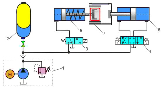 Hydraulic circuit diagram: 1—hydraulic power unit, 2—HPA, 3—directional control valve, 4—directional control valve, 5—long stroke cylinder, 6—short stroke cylinder, 7—injection moulding machine.