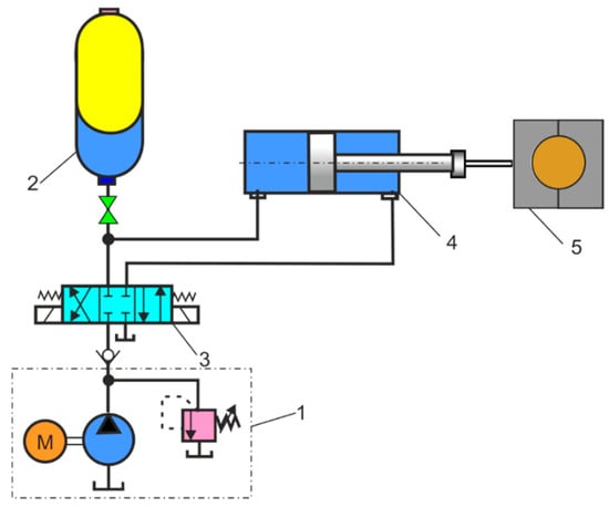 Hydraulic circuit diagram: 1—hydraulic power unit, 2—HPA, 3—directional control valve, 4—cylinder, 5—clamping device.