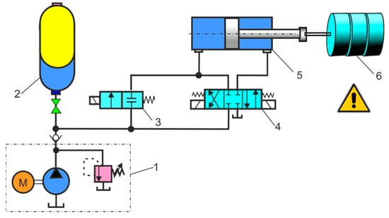 Hydraulic circuit diagram: 1—hydraulic power unit, 2—HPA, 3—on/off safety valve, 4—directional control valve, 5—cylinder, 6—feed device.