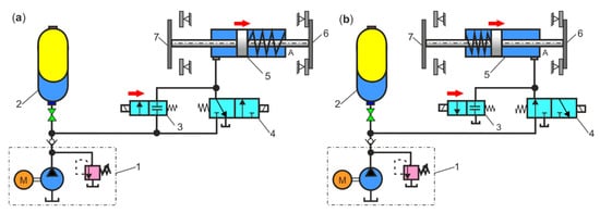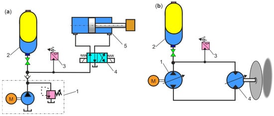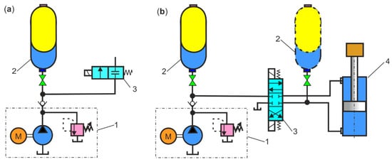 Hydraulic circuit diagram: (a) HPA as leak compensator: 1—hydraulic power unit, 2—HPA, 3—pressure switch, 4—4/2 directional control valve, 5—cylinder; (b) HPA as thermal expansion compensator: 1—pump, 2—HPA, 3—pressure switch, 4—hydraulic motor.