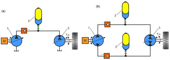 General hydraulic propulsion with energy regeneration: (a) open-loop system; (b) closed-loop system: 1—hydraulic pump, 2—HPA, 3—hydraulic motor/pump.