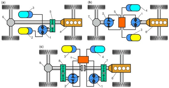 Basic structure of HHD. (a) PHH: 1—pump/motor unit, 2—high-pressure HPA, 3—low-pressure HPA, 4—ICE, 5—mechanical gear, 6—differential; (b) 1—pump/motor unit, 2—motor/pump unit, 3—high-pressure HPA, 4—low-pressure HPA, 5—valve block, 6—ICE, 7—differential; (c) SPHH: 1—pump/motor unit, 2—motor/pump unit, 3—high-pressure HPA, 4—low-pressure HPA, 5—valve block, 6—ICE, 7, 8—mechanical gears, 9—differential.