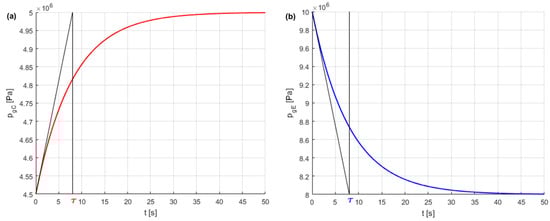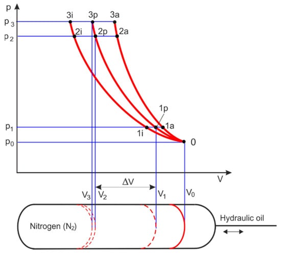 The following parameters are marked in Figure 11: p0 is the relative pre-charge pressure, p1 is the minimum working relative pressure of the hydraulic circuit, p2 is the maximum relative working pressure of the hydraulic circuit, p3 is the calibration relative pressure of the safety valve, V0 is the volume of gas under the pressure p0, V1 is the volume of gas under the pressure p1, V2 is the volume of gas under the pressure p2, V3 is the volume of gas under p3 pressure, and ΔV is the useful (effective) volume. The actual conditions for the gas expansion and expansion processes in the HPA follow the general polytropic process with exponent n, but under state conditions it is assumed that n = κ = 1.4 for the adiabatic process and n = 1 for the isothermal process. In ideal slow-changing gas compression and expansion, isothermal processes are assumed, and in ideal fast-changing gas compression and expansion, adiabatic processes are assumed. For pressures above 20 MPa, the real gas behaviour deviates considerably from the ideal, which reduces the effective fluid volume.