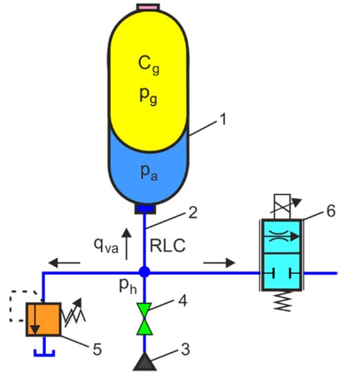 The main task of using HPA in hydraulic systems is to save energy. In hydraulic systems where there is a high-power demand in a short time, an economical solution is achieved using HPAs. Accuracy and precision of operation are required in modern hydraulically driven machines, which are exposed to vibrations and pressure shocks. The use of HPAs makes it possible to suppress pulsations and pressure spikes, reduce noise levels, and extend the life of the machines. Basic applications of HPAs in hydraulic systems are available in catalogues of hydraulic accumulator manufacturers [32,33,34,35,36,37,38], specialist books [39,40], and academic books [41,42].