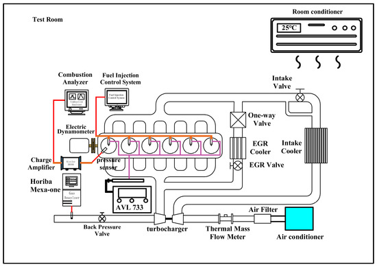 The schematic diagram of the test bench is shown in Figure 1. The sixth cylinder pressure is recorded at the resolution of 0.5 °CA by a piezoelectric pressure sensor (Kistler 6125B) combined with a charge amplifier (Kistler 5018A), using an in-house data acquisition system. The pressure data of 100 consecutive cycles are averaged for apparent heat release rate (AHRR) calculation according to the thermodynamic model in the reference [21]. Further, fuel consumption is measured by AVL733. The test fuel is 0# diesel which is commercially available on the Chinese market. The diesel fuel’s low heat value in this study is taken as 42.8 MJ/kg. NOx emission is measured by Horiba Mexa-one. In addition, an environmental conditioner and intake air conditioner are applied to control the laboratory room temperature, intake air temperature, and humidity, respectively. The coolant-out temperature is maintained at 88 °C. The main specifications of the instruments are shown in Table 4.