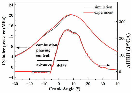 For combustion modeling, a user-imposed combustion profile model is used to describe the combustion process, which assumes that the rate of conversion from reactant to product is proportion to the imposed burn rate. No kinetic models, intermediate species, or dissociation products are calculated. The imposed burn rate used in the 1D simulation is inferred by measurements of cylinder pressure to simulate the combustion behavior. Some literature [11,35] suggests that the occasion exists that changes in boundary conditions such as compression ratio or IVC timing result in relatively small variations in the combustion heat release profile. And piston profile optimization can help to optimize the heat release rate to overcome the impact, which is out of the scope of this study. Therefore, the user-imposed combustion profile model is a reasonable choice in terms of the scope of this study and the computation resources required by cases in this study. What is more, this method has also been applied in other academic papers [8,10,36]. Based on experimental experience, within the range of boost pressures examined in this paper, the excess air coefficient exceeds 1.5. Usually, the combustion completeness of the investigated turbocharged diesel engine is nearly 100%. So, the combustion completeness is assumed to be 100 percent. It is worth noting that combustion phasing adjustment is achieved by shifting the combustion profile in the x-axis direction during the simulation procedure, as shown in Figure 3.