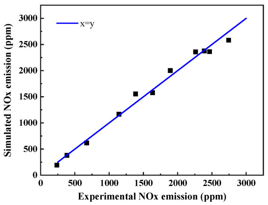 The extended Zeldovich mechanism is applied to predict NOx emission. In addition to the NOx emission data of the studied operating condition, more data are collected by adjusting injection timing, injection pressure, and HP EGR ratio, varying from 500 to 3000 ppm, and are used to validate the employed NOx model, as shown in Figure 4.
