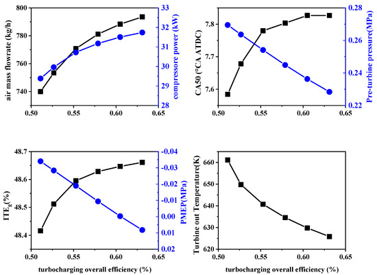 In this paper, turbocharging overall efficiency is defined as the product of compressor isentropic efficiency and turbine isentropic efficiency, which represents the ratio of the compressed air enthalpy increment relative to reclaimed exhaust gas enthalpy. The maximum turbocharging overall efficiency is about 0.63, according to the turbocharger supplier [33], and the value for the studied operating condition at the baseline specification is 0.51. Figure 6 shows that ITEn significantly increases from 47.59% to 48.86% when the turbocharging overall efficiency increases from 0.51 to 0.63. In order to explain the improvement in ITEn, the effects of turbocharging overall efficiency on air mass flow rate, compressor power, combustion phasing, pre-turbine pressure, and ITEg are shown in Figure 7. It is seen that the air mass flow rate and compressor power are elevated with the increase in turbocharging overall efficiency, while the pre-turbine pressure declines. At the same time, combustion phasing, represented by CA50, is slightly postponed to comply with the PCP constraint. As a result, ITEn is improved for the enhanced combustion air dilution extent and pumping work improvement, changing from a negative value to a positive value. In product engines, turbocharging overall efficiency varies with operating conditions as turbine and compressor isentropic efficiencies change with air mass flow rate and compression ratio. This indicates that the turbocharger should be dedicated to operating efficiently at the target operating point for maximum thermal efficiency improvement. On the other hand, PMEP which represents the pressure difference between pre-turbine and manifold undergoes a transition from negative to positive with turbocharging overall efficiency raised. Therefore, HP EGR is hard to introduce. The role of HP EGR in such a high-efficiency air system is examined in Section 3.1.4. What is more, high turbocharging overall efficiency results in low exhaust temperature, which would cause deterioration in the after-treatment conversion efficiency. In the following section, the turbocharging overall efficiency is set at 0.63 for the best-case assessment.